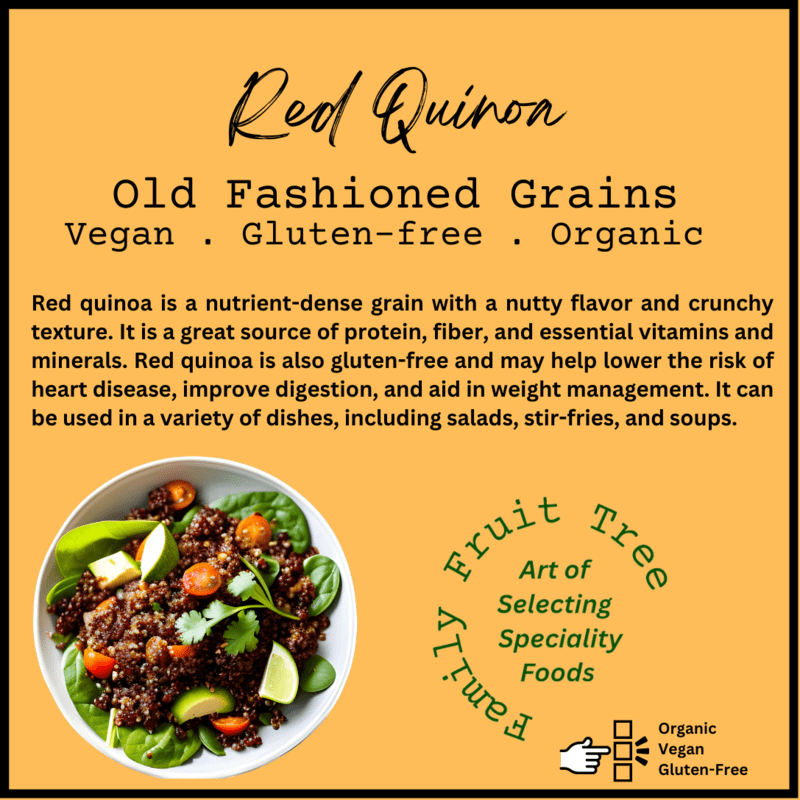 Red quinoa is a nutrient-dense grain with a nutty flavor and crunchy texture. It is a great source of protein, fiber, and essential vitamins and minerals. Red quinoa is also gluten-free and may help lower the risk of heart disease, improve digestion, and aid in weight management. It can be used in a variety of dishes, including salads, stir-fries, and soups.