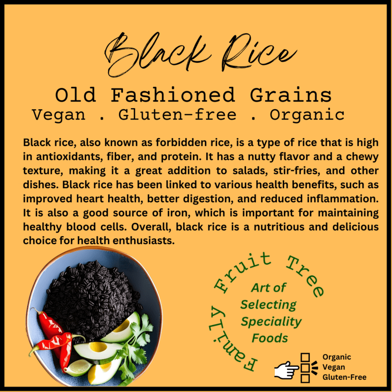 Black rice, also known as forbidden rice, is a type of rice that is high in antioxidants, fiber, and protein. It has a nutty flavor and a chewy texture, making it a great addition to salads, stir-fries, and other dishes. Black rice has been linked to various health benefits, such as improved heart health, better digestion, and reduced inflammation. It is also a good source of iron, which is important for maintaining healthy blood cells. Overall, black rice is a nutritious and delicious choice for health enthusiasts.